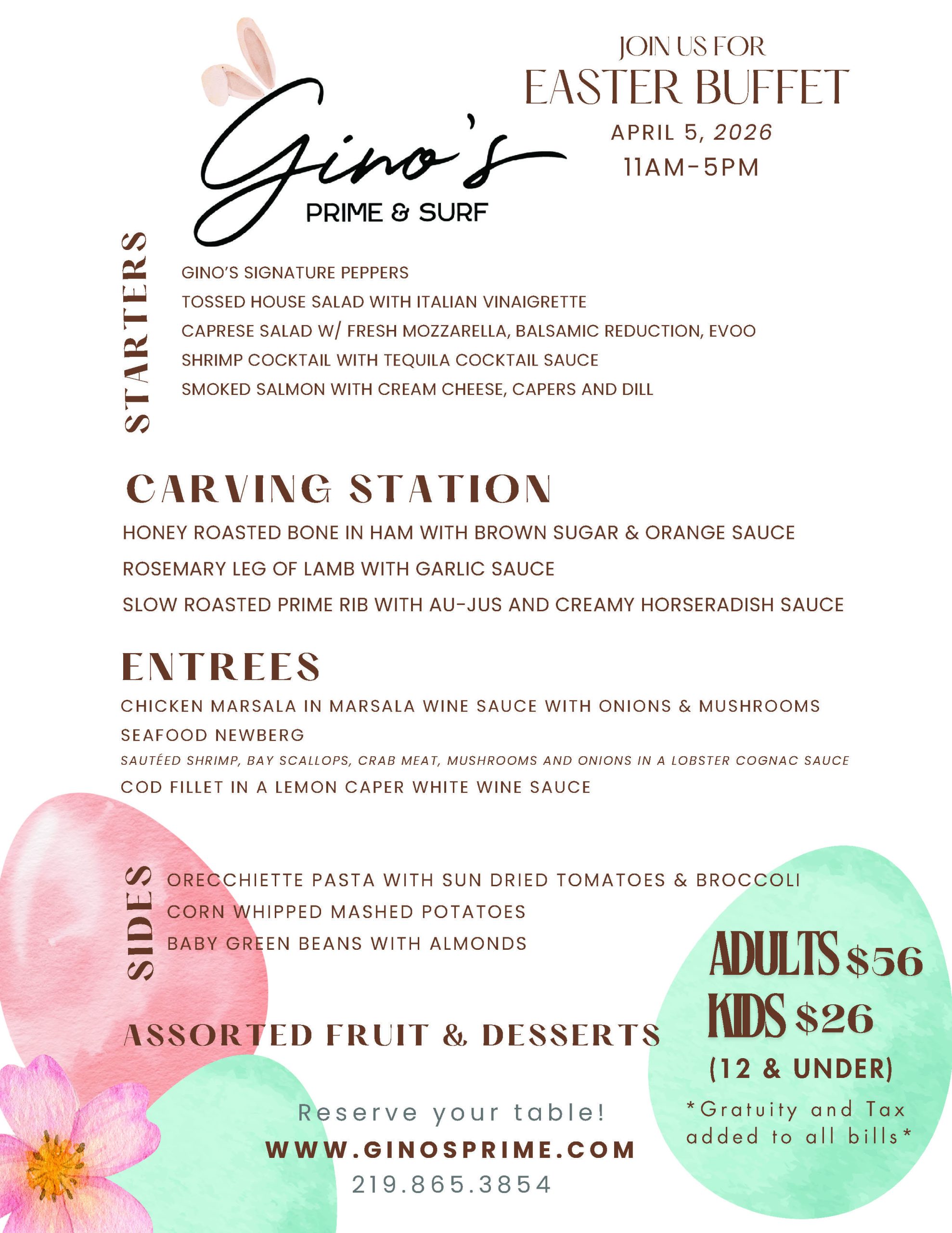 Celebrate Easter Sunday with family and friends at Gino’s Prime & Surf. Join us for a memorable holiday buffet in a warm and welcoming atmosphere, where great food and great company come together.